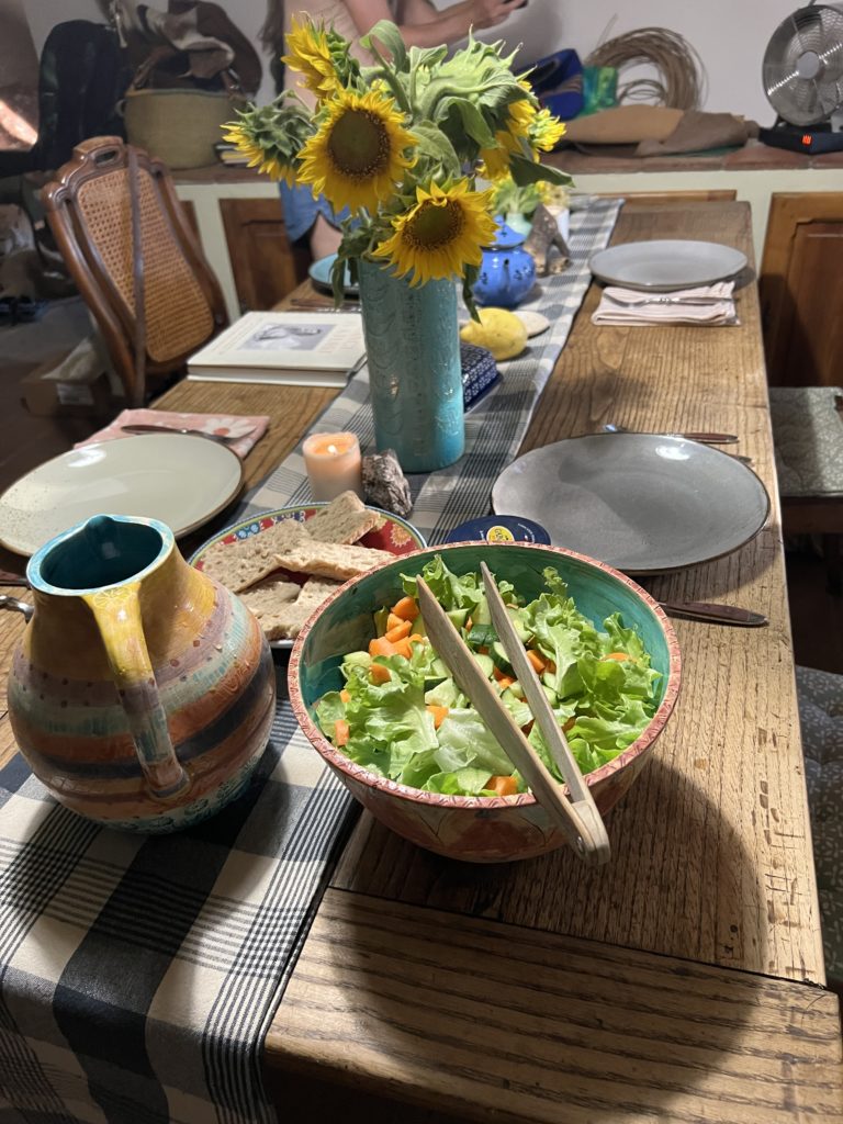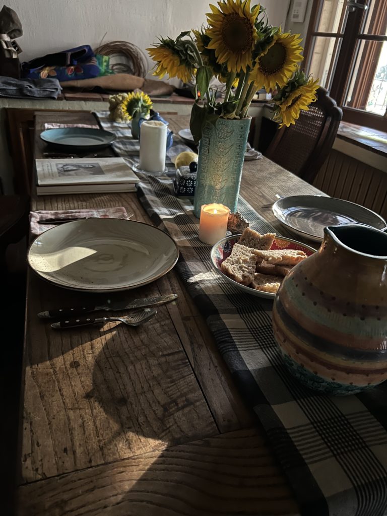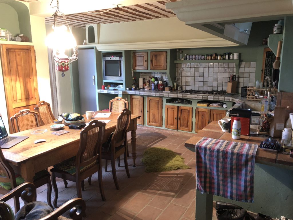 This cozy kitchen is the welcoming heart of the house, full of authentic Provençal charm. Its traditional ceiling of wood beams with alternating planks and plaster creates warmth and character. Masonry cupboards with handcrafted wooden doors add timeless appeal, while a long farmhouse table invites shared meals and lively conversation. A wood-burning fireplace with a classic bread oven offers both function and coziness, perfect for baking bread or pizzas together. Accented with pottery, sunflowers, and hand-painted ceramics, La Cuisine is more than just a kitchen—it is a gathering place where food, stories, and laughter naturally come together.